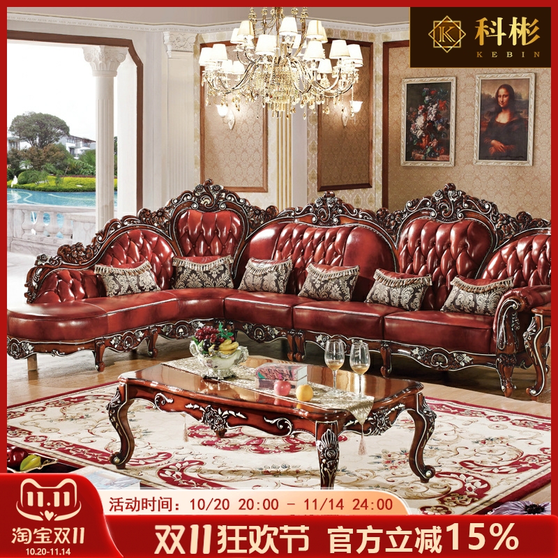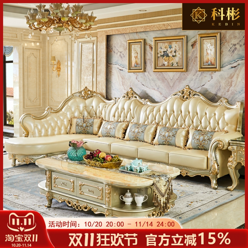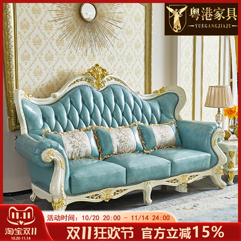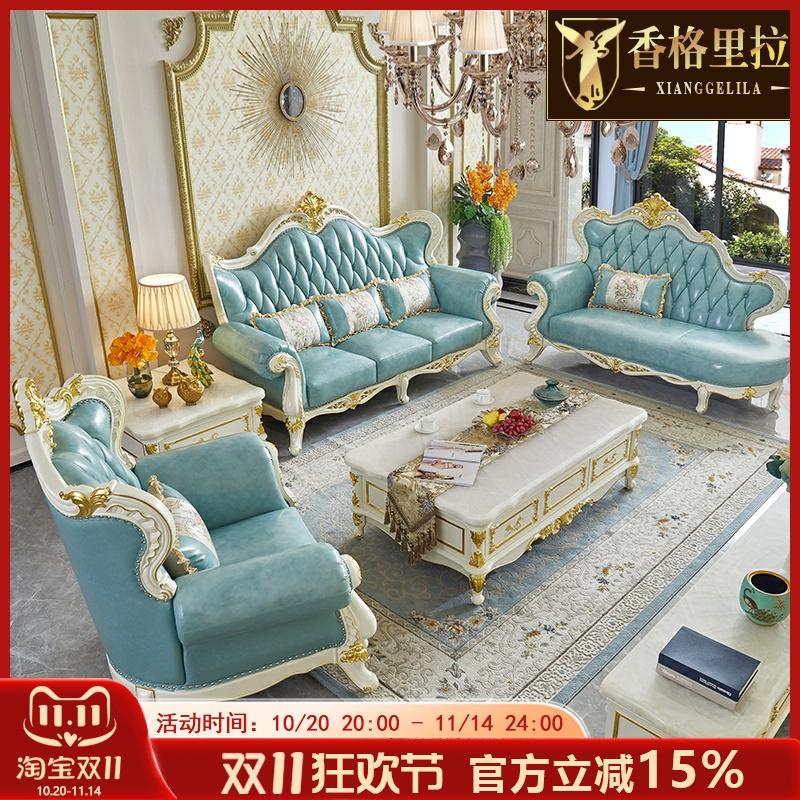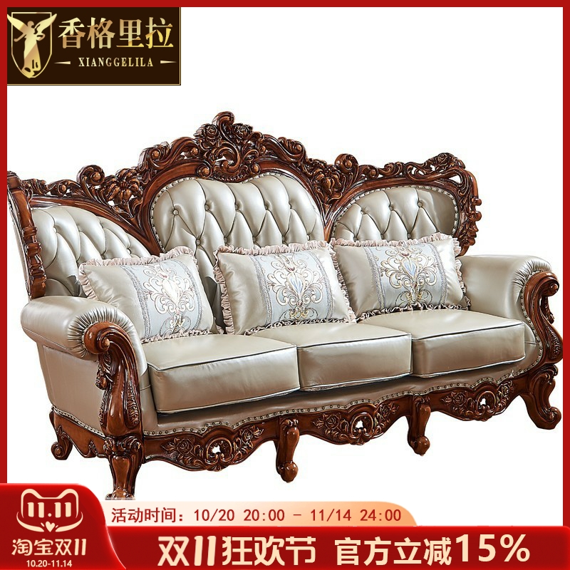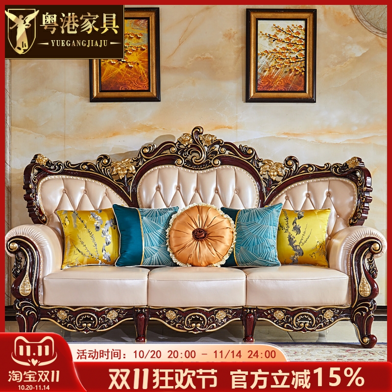 欧式真皮沙发美式别墅客厅实木雕花描金银1234组合皮艺沙发可定制