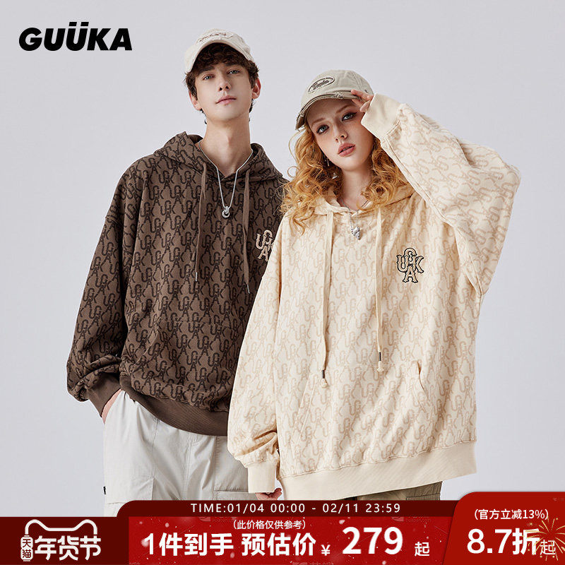 GUUKA潮牌cityboy日系连帽卫衣男新款情侣奶黄色复古满印帽衫宽松
