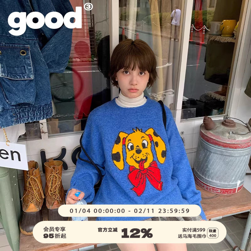 美好商店MeihaoStore黄色斑点绅士小狗头圆领宝蓝色套头毛衣