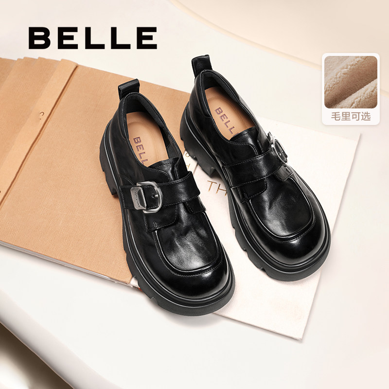 张凌赫推荐百丽黑巧乐福小皮鞋女复古英伦风黑色厚底增高单鞋子预