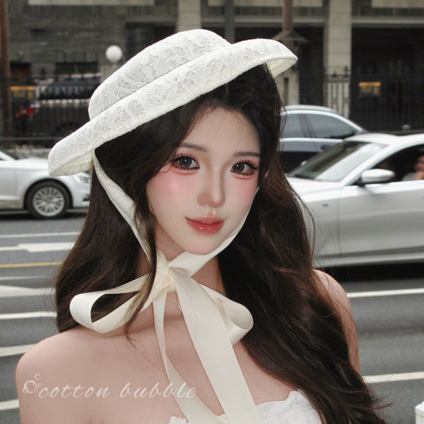 韩系白色蕾丝绑带礼帽头饰女法式千金赫本风帽子气质方圆脸遮阳帽