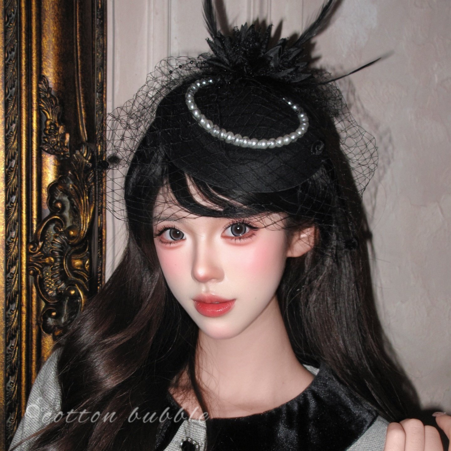 法式赫本风黑色小礼帽头饰民国复古网纱珍珠羽毛发饰礼服拍照帽子