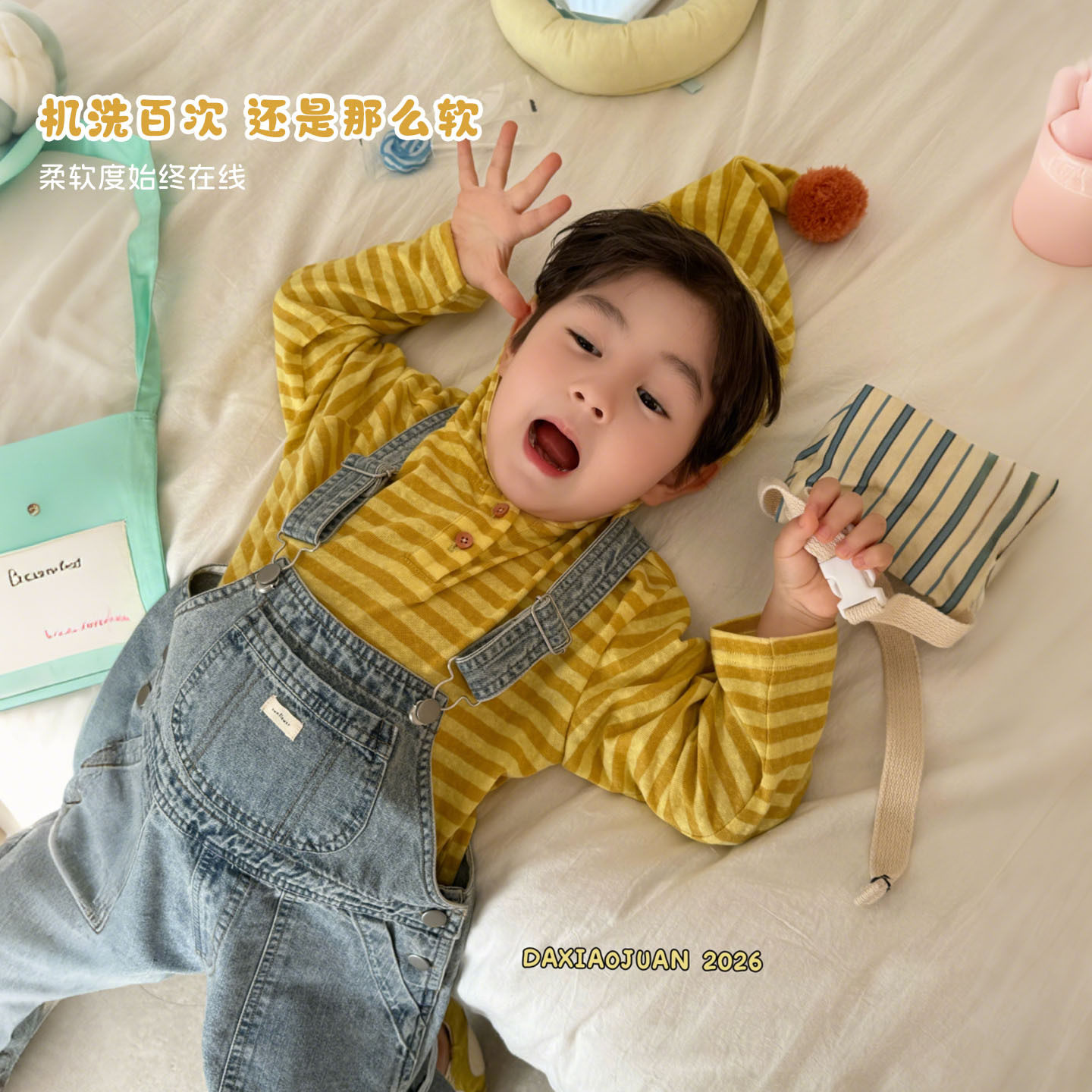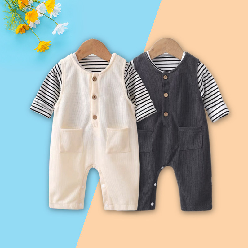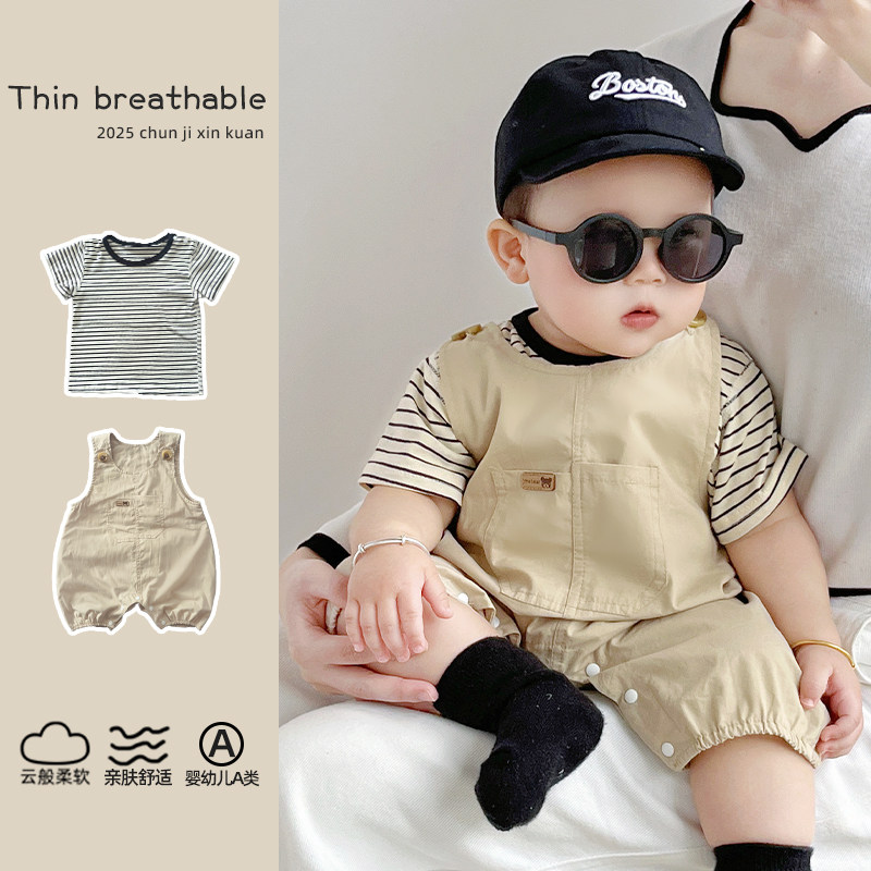 2026新品春季男宝宝韩版背带裤套装婴幼儿洋气条纹打底衫两件套