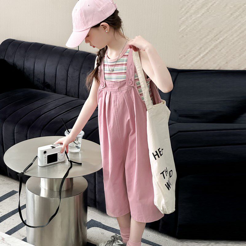 女童夏装套装2025新款大童洋气网红条纹背心韩版背带裤中裤两件套