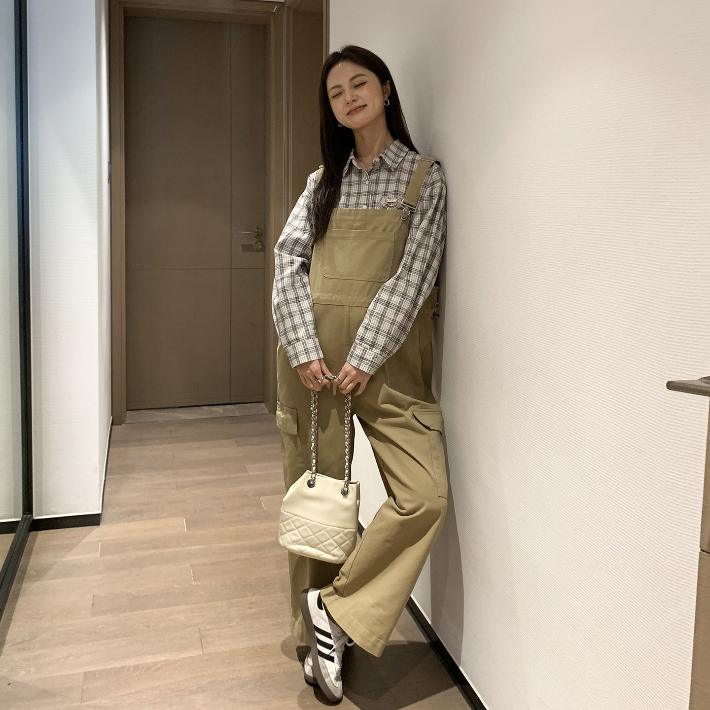 诺初◆孕妇装韩版背带裤+格子衬衫套装春装新款休闲工装裤两件套