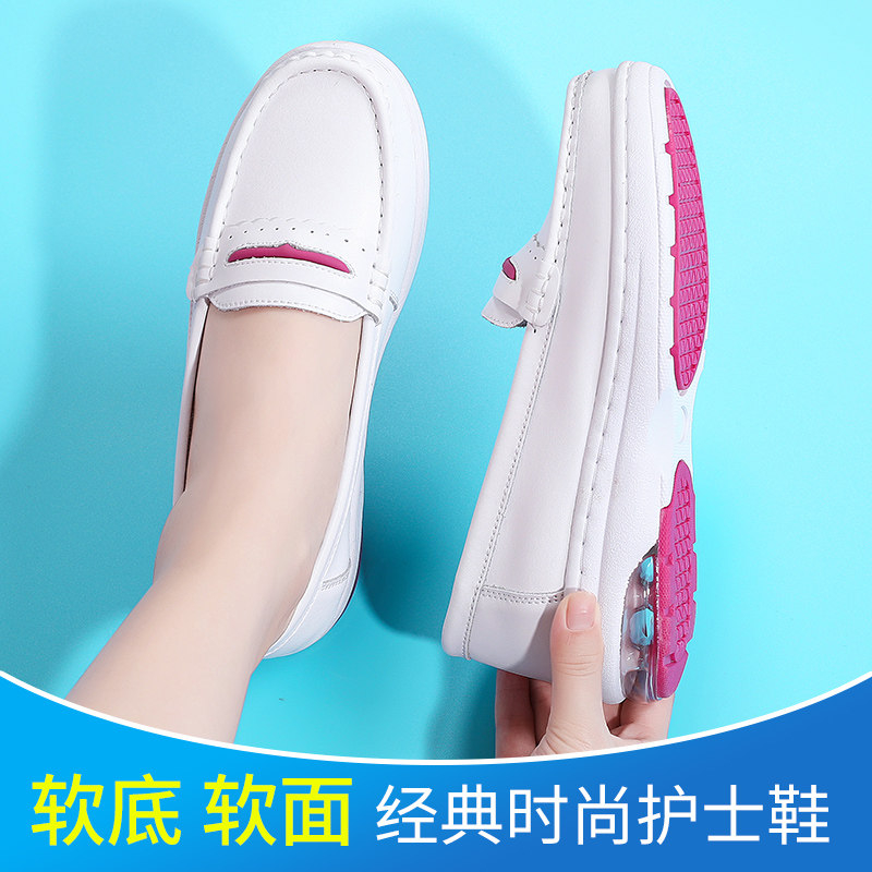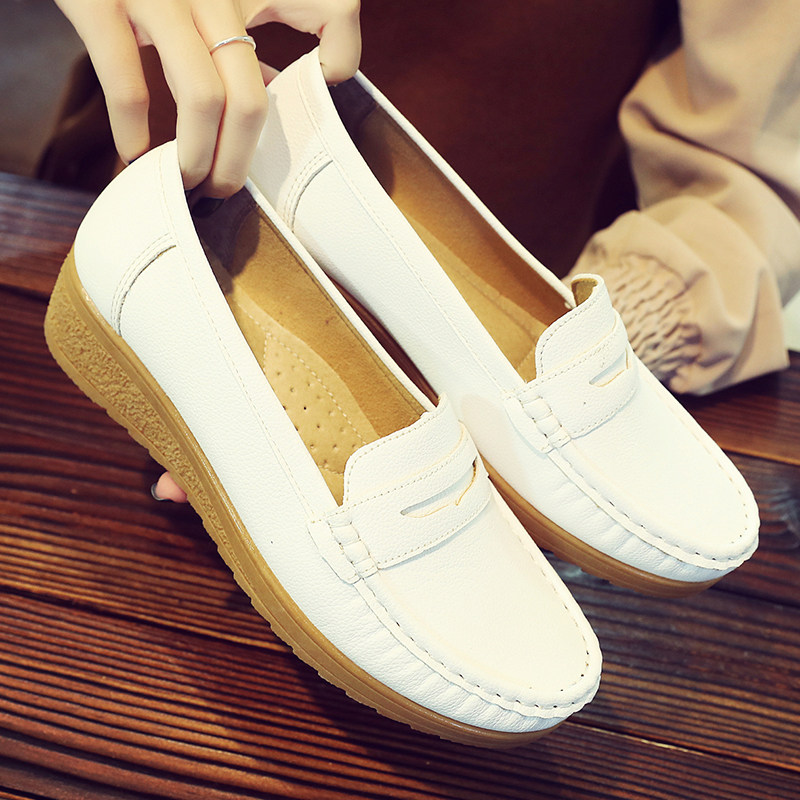 真皮白色护士工作鞋皮鞋女单鞋浅口坡跟软底女鞋中年妈妈鞋子瓢鞋
