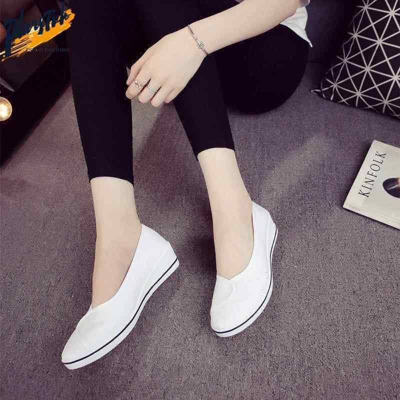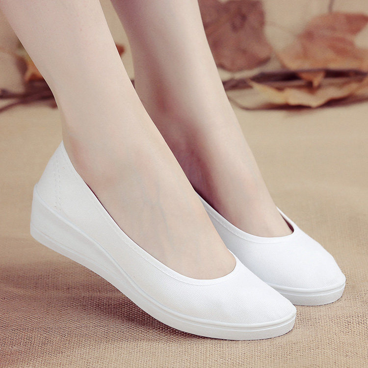 一字护士鞋白色坡跟帆布鞋女美容院上班鞋软底防滑透气医护工作鞋