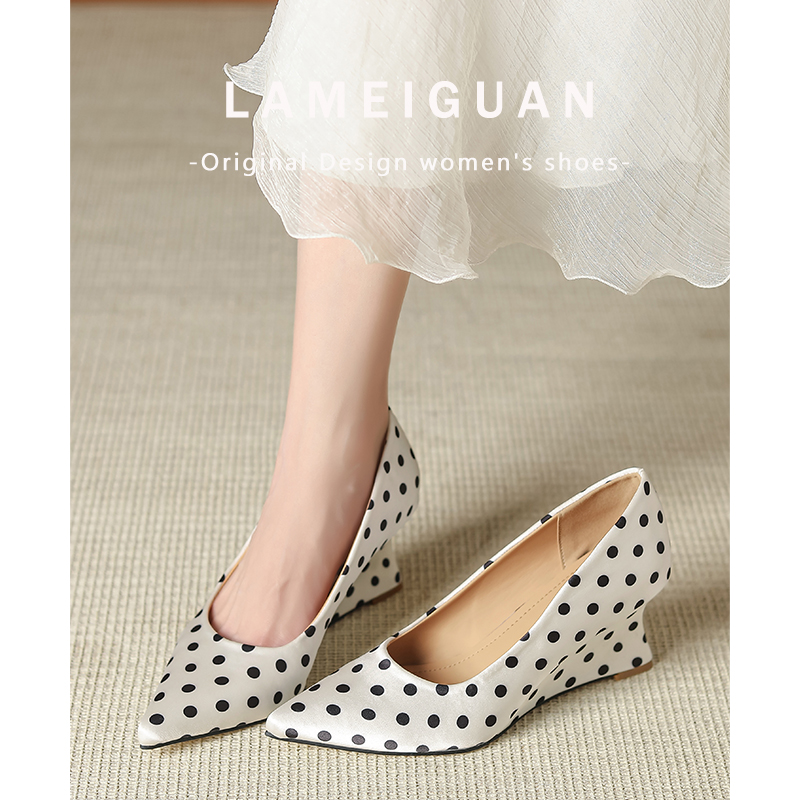 气质白色波点尖头法式高跟鞋秋女2025新款绝美坡跟浅口配裙子单鞋