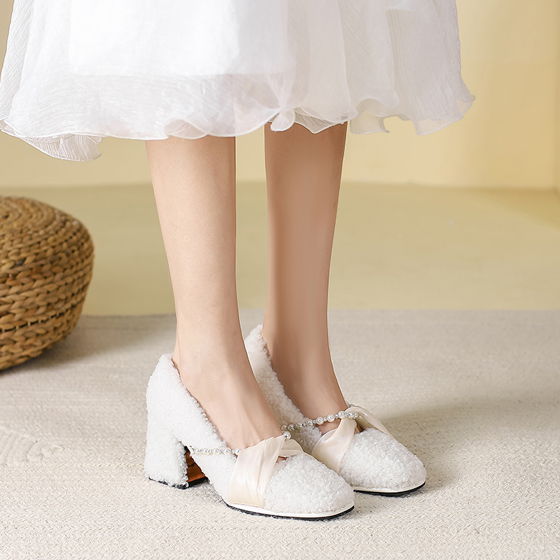 白色羊羔毛毛鞋仙女冬加绒外穿棉单鞋2025新款法式珍珠高跟鞋粗跟