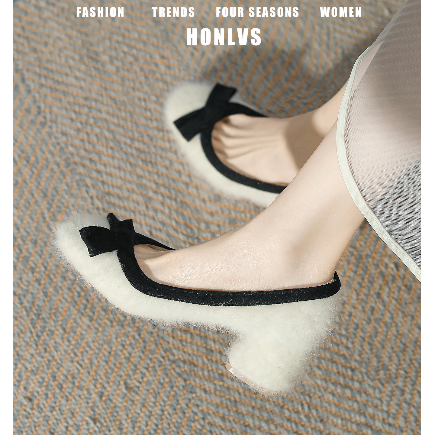 法式小香风高跟毛毛鞋女冬加绒2025新款白色高跟鞋蝴蝶结温柔单鞋