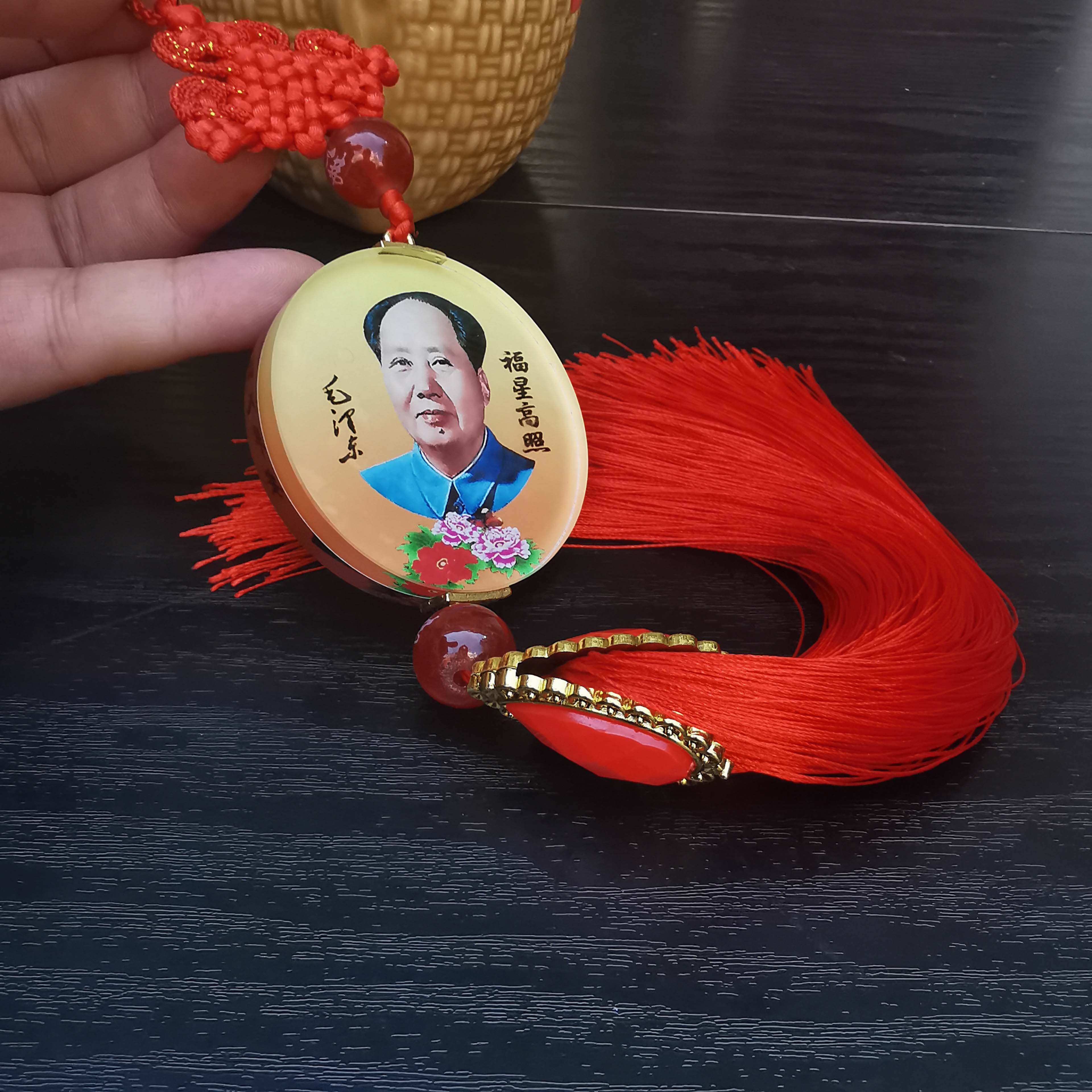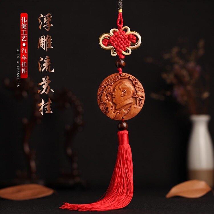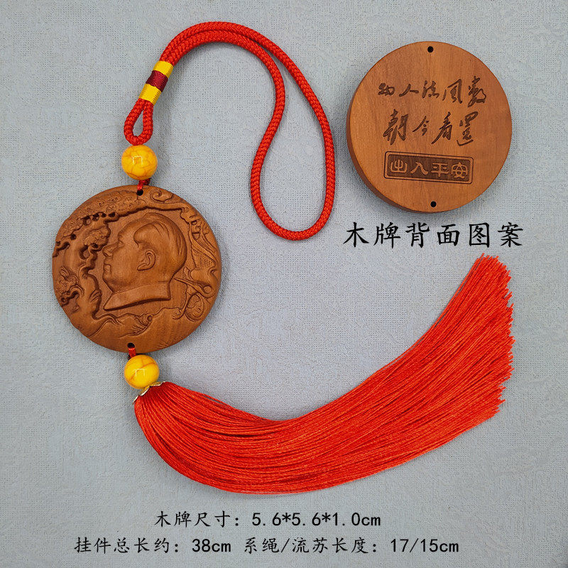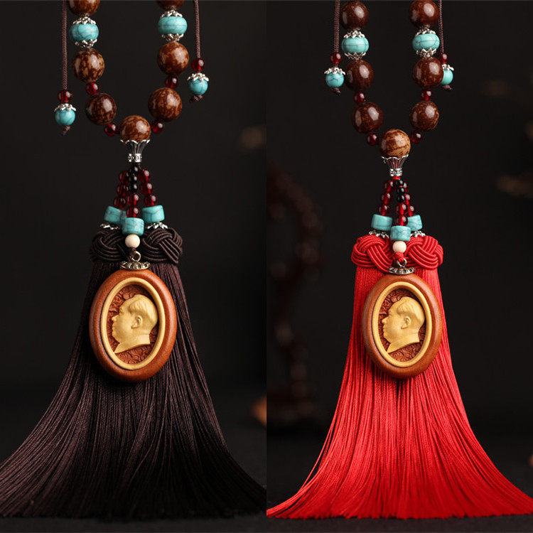 汽车挂件内饰用品黄杨木桃木雕刻镶嵌毛主席头像菩提咖红色双流苏