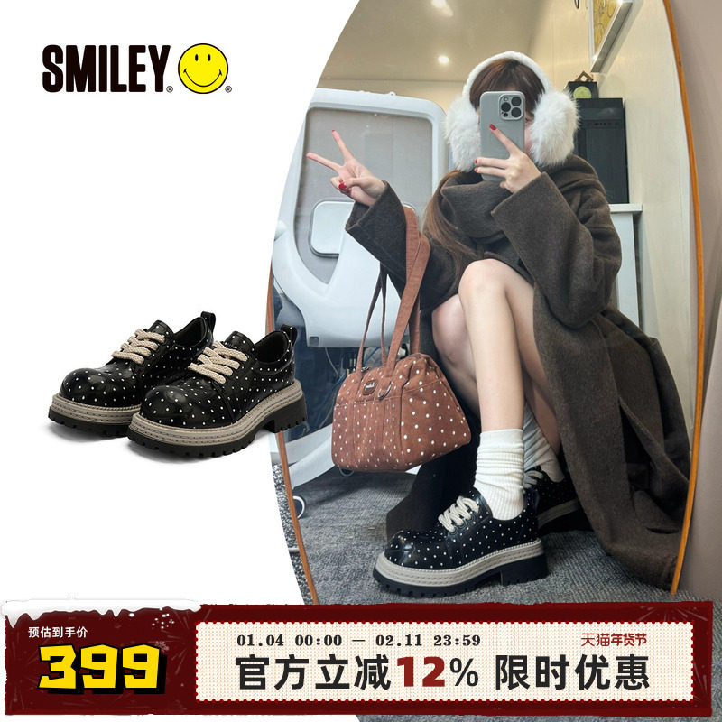 SMILEY笑脸黑色波点女小皮鞋德比鞋乐福鞋增高春季圆头学院风休闲