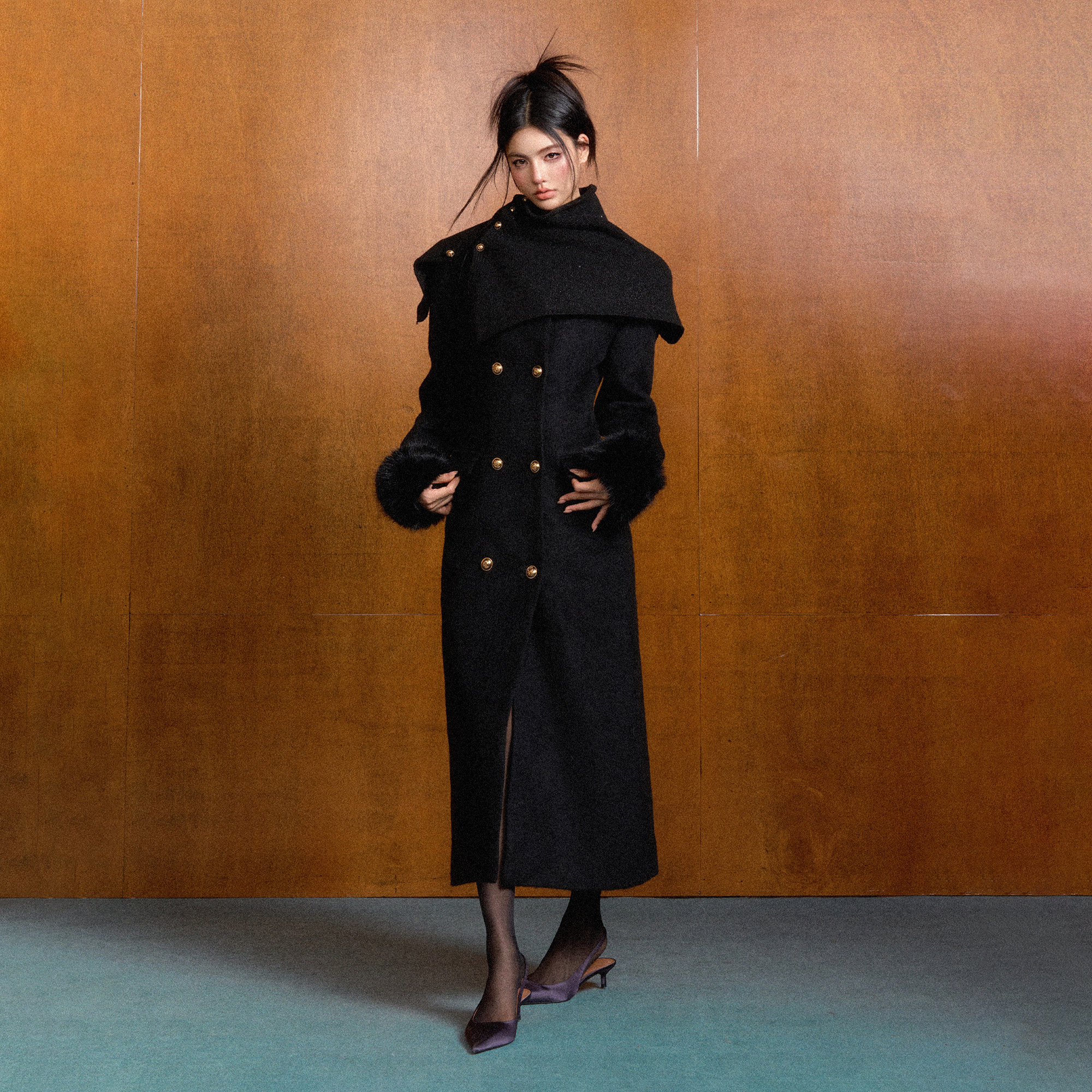 AGAM 冬季长款可拆皮草收腰修身留洋千金羊毛毛呢大衣+毛织围脖