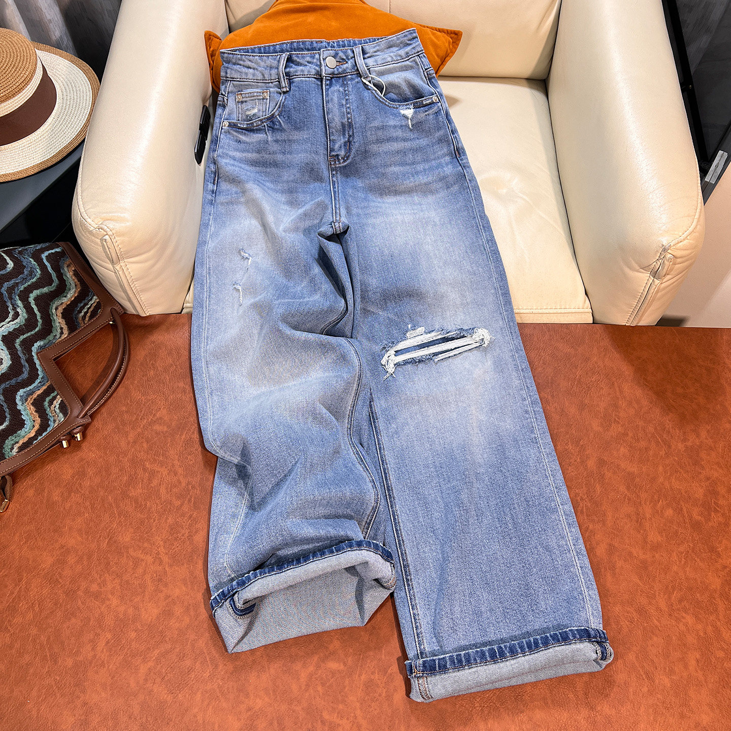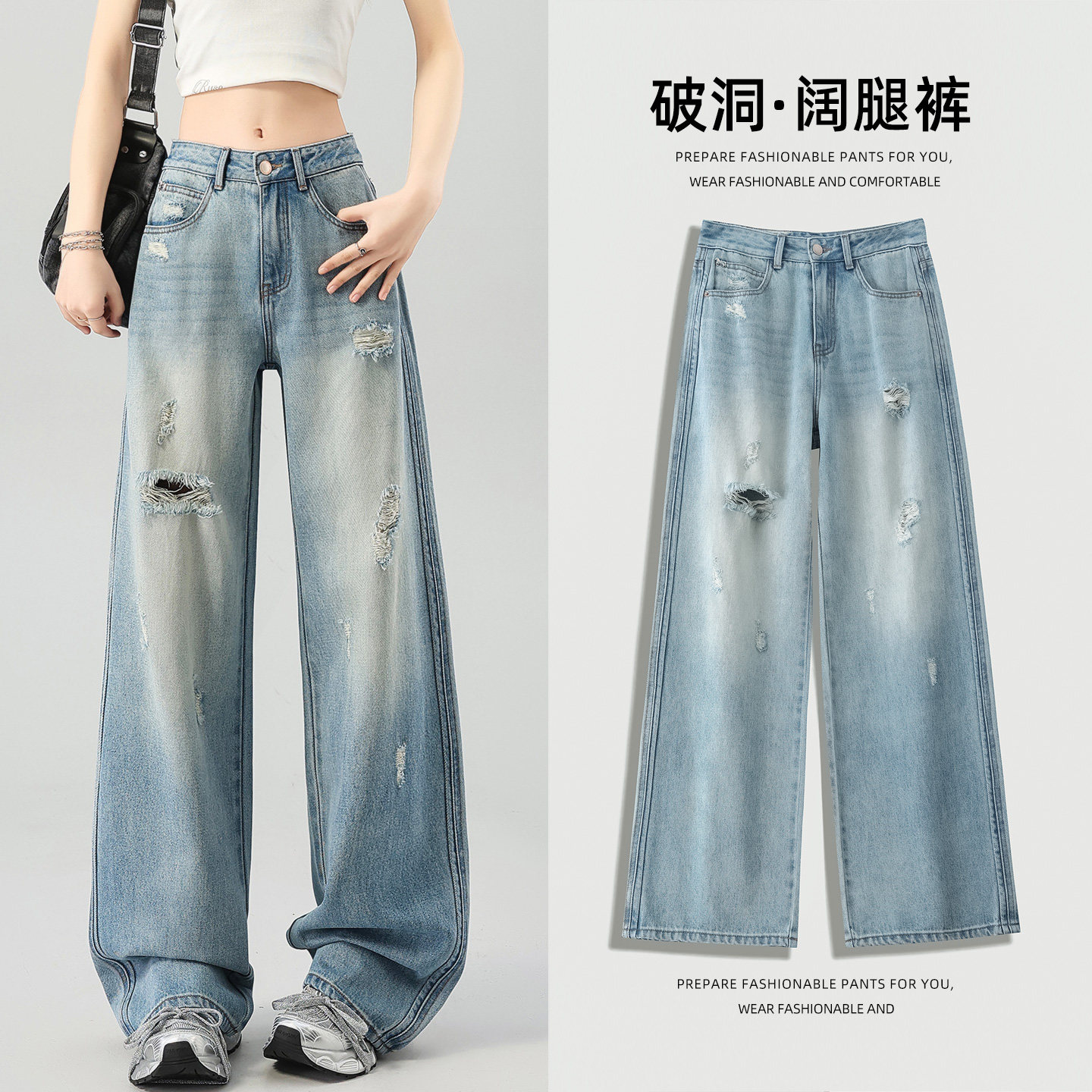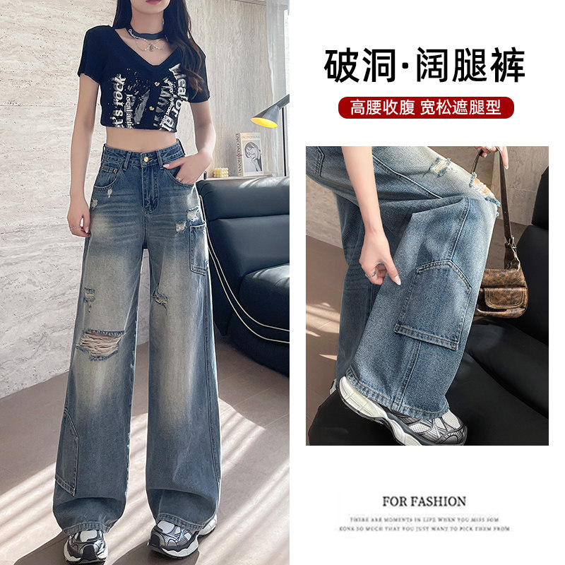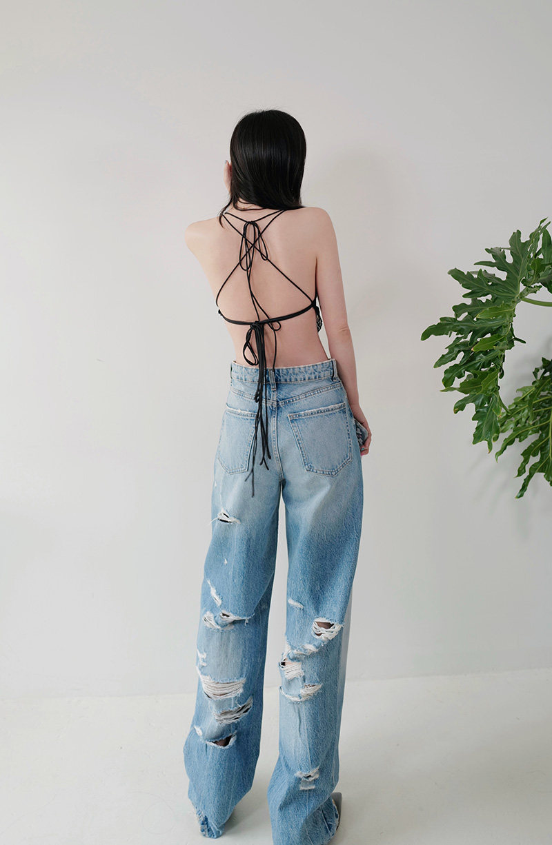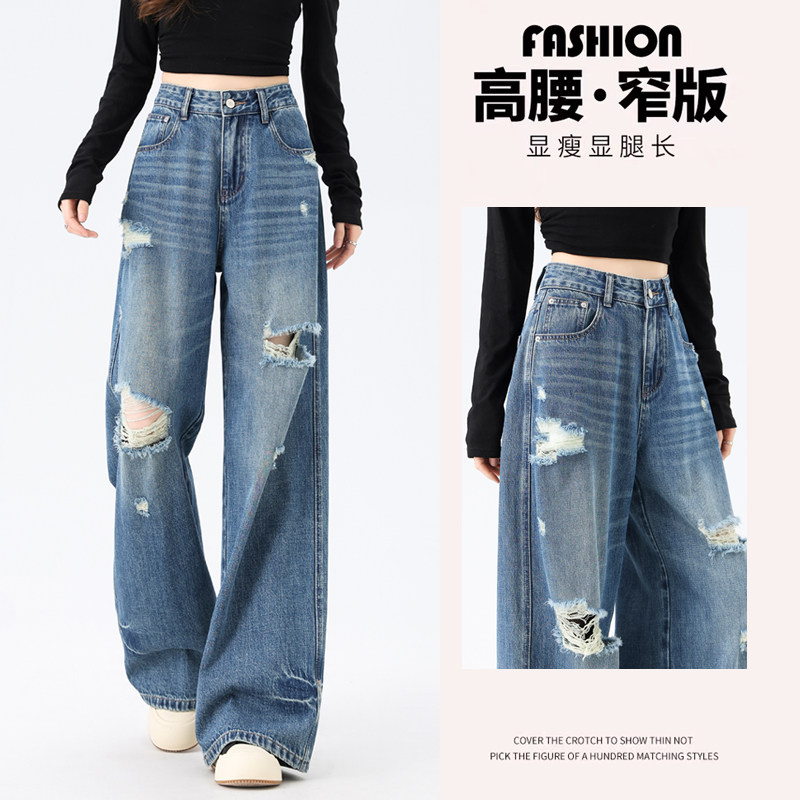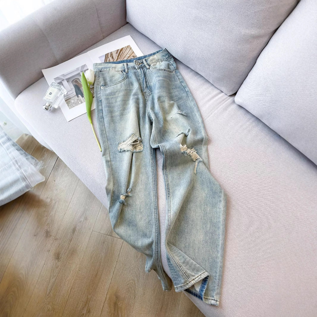 - 破洞直筒牛仔裤女