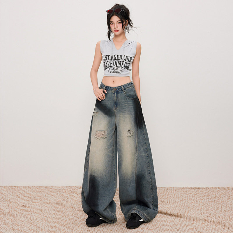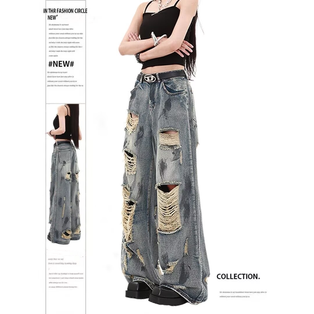 - 乞丐宽松破洞牛仔裤女