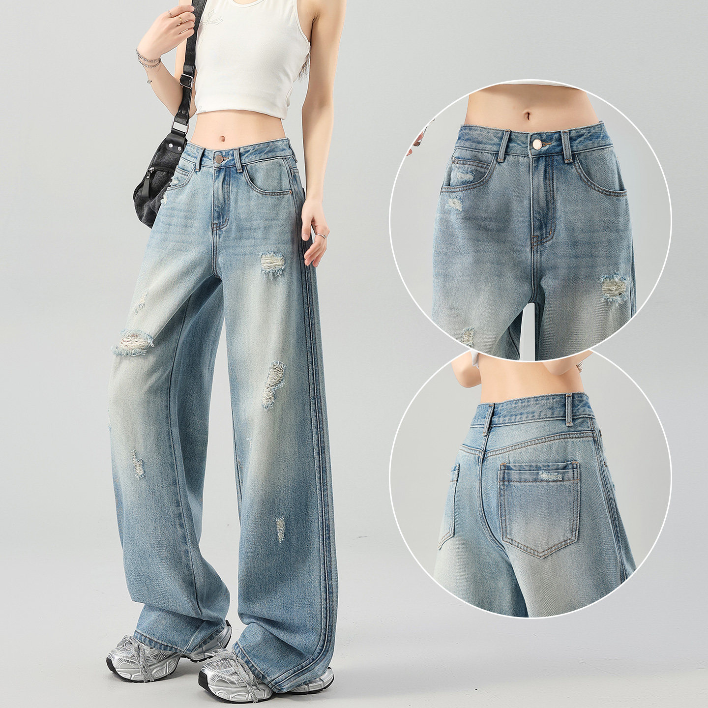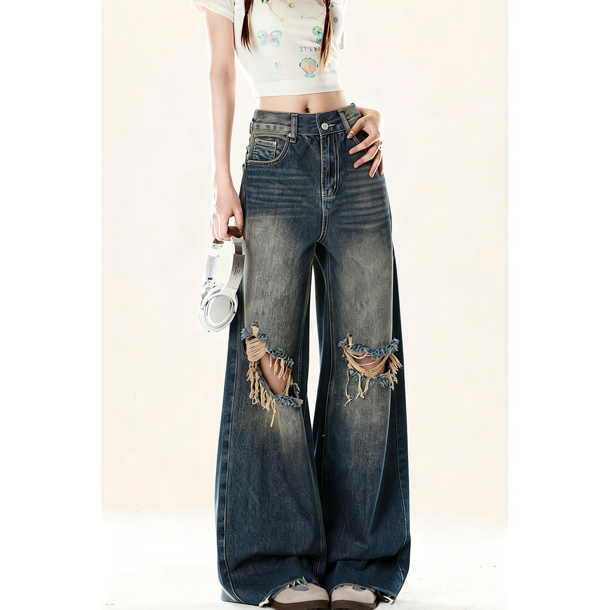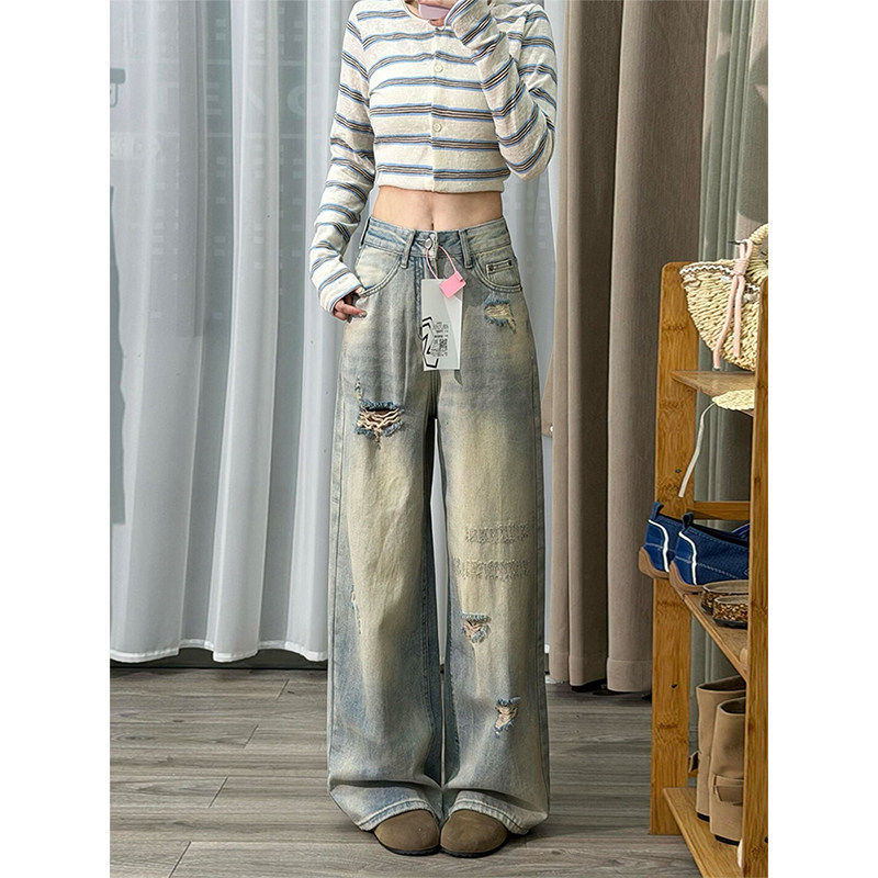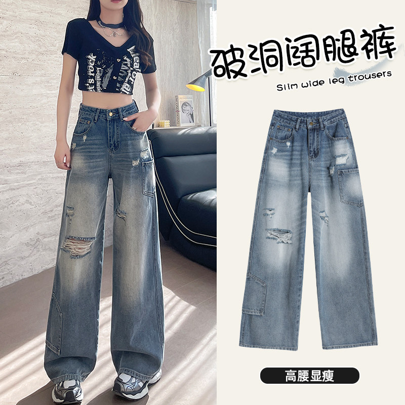 复古破洞磨白高腰显瘦宽松阔腿裤2025秋季新款百搭女裤牛仔裤V624