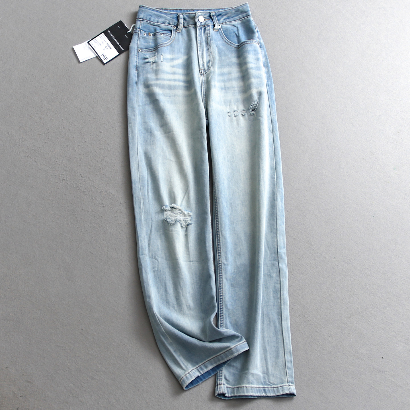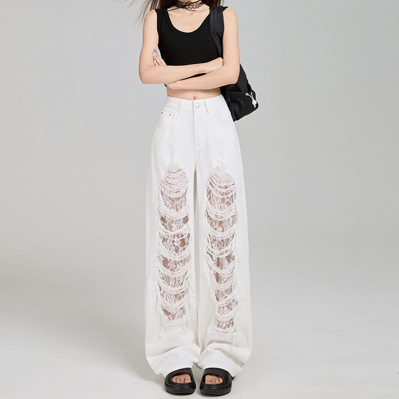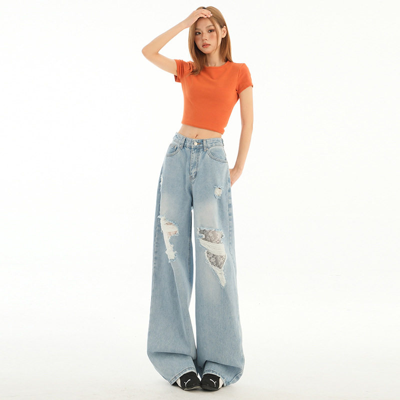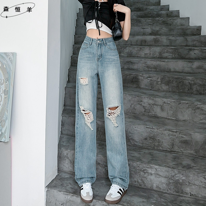 猫猫家加长女裤春夏薄款水洗破洞牛仔裤女轻高腰宽松浅色阔腿长裤