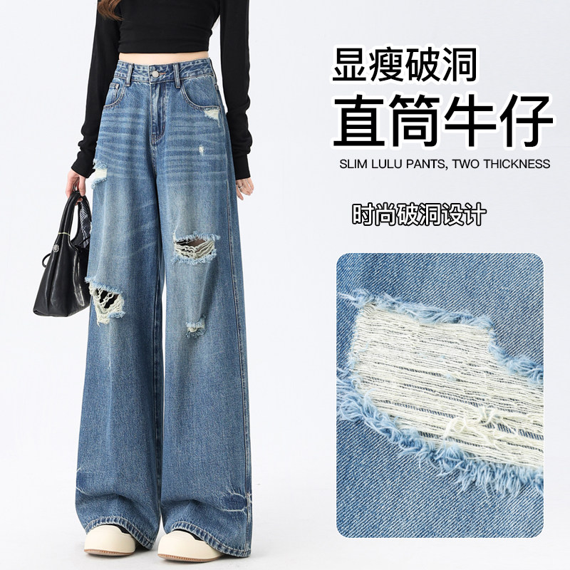 阔腿破洞牛仔裤女春秋2026新款高腰显瘦宽松休闲时尚直筒拖地长裤