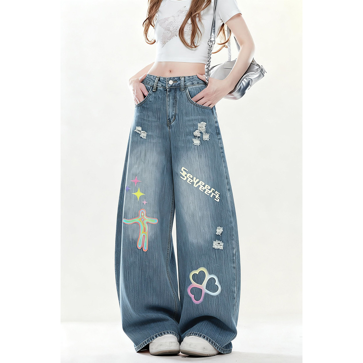 ZRSEE 美式涂鸦破洞牛仔裤女早春新款个性宽松印花设计感弯刀裤子