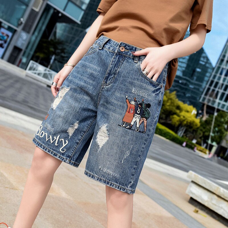 牛仔短裤女破洞2021夏季新款薄款高腰中裤宽松女裤直筒五分裤马裤