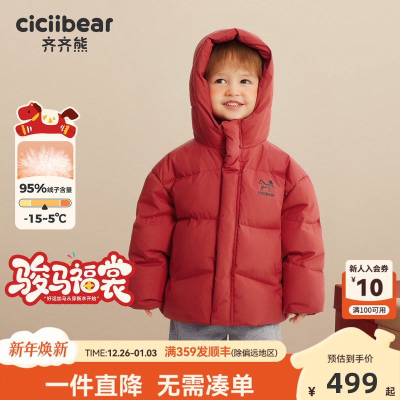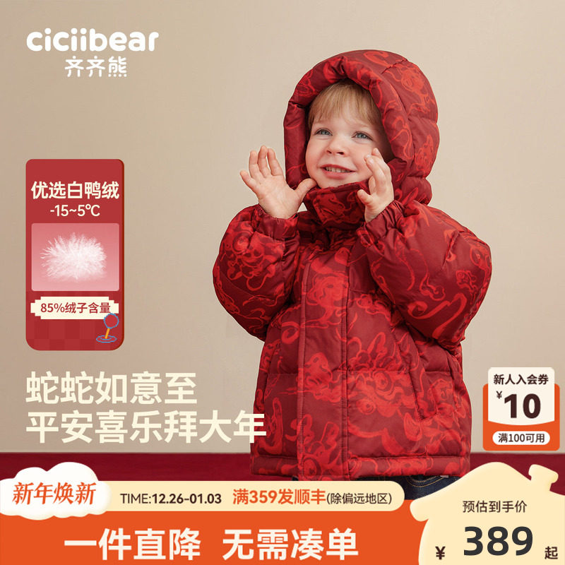 [小暖盾95绒]齐齐熊宝宝羽绒服男女童冬装红色新年极寒保暖面包服