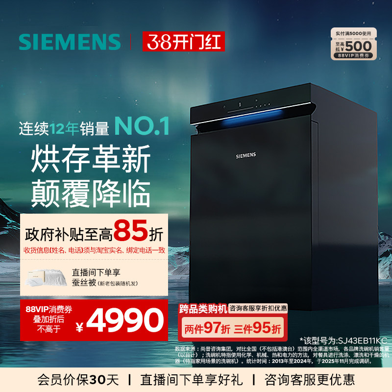 新品西门子SJ43HB88KC家用全自动嵌入式洗碗机16+3套极净魔盒2.0