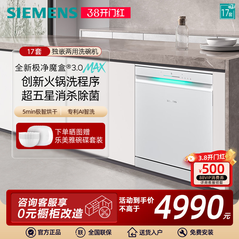新品首发|西门子17+3套极净魔盒3.0Max独立嵌入式洗碗机家用EW88