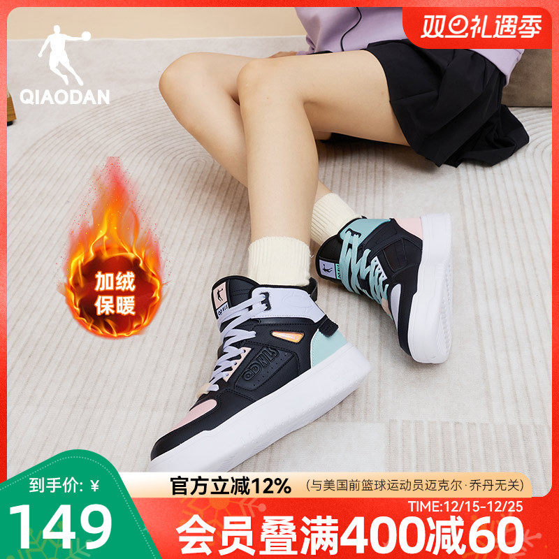 乔丹冬季加绒保暖运动棉鞋新款女板鞋高帮皮面黑白学生休闲鸳鸯鞋