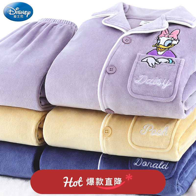 迪士尼儿童睡衣秋冬珊瑚绒女童家居服男童法兰绒加绒加厚套装宝宝