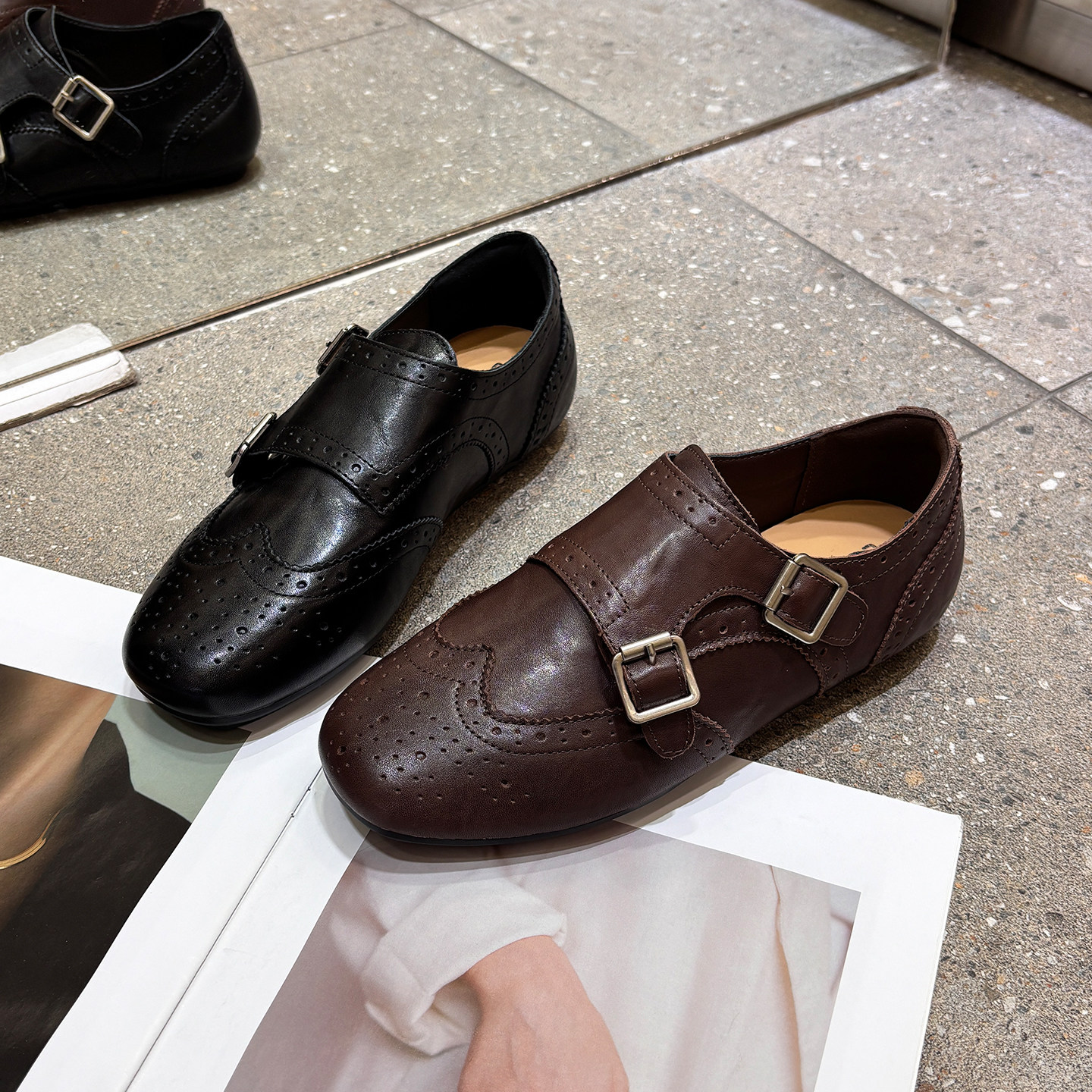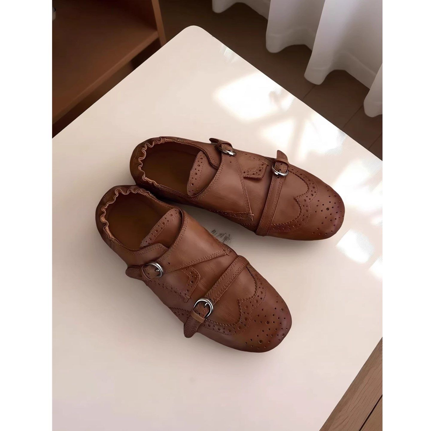 复古真皮平底布洛克鞋2026春新款时髦双皮带扣单鞋雕花圆头小皮鞋