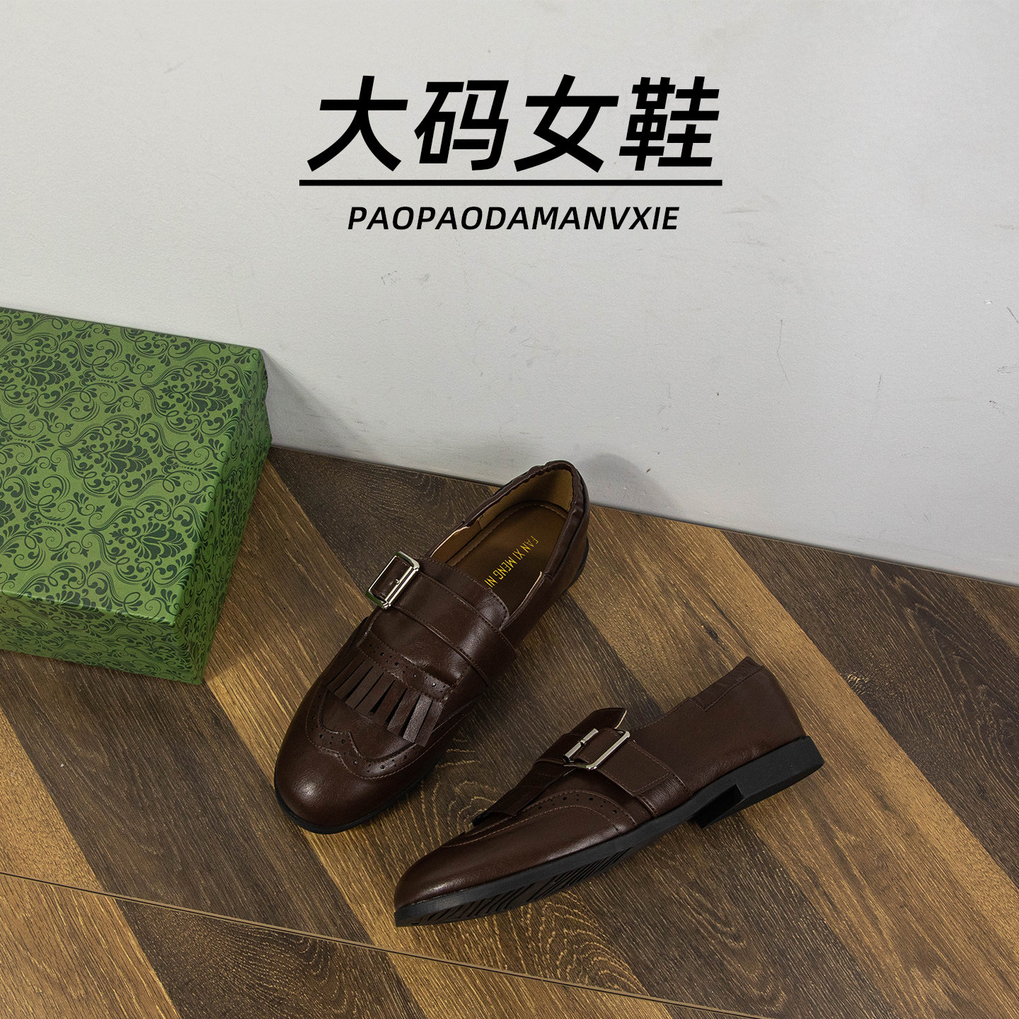 大码女鞋41到42宽脚胖小皮鞋复古流苏布洛克乐福鞋平底单鞋冬季