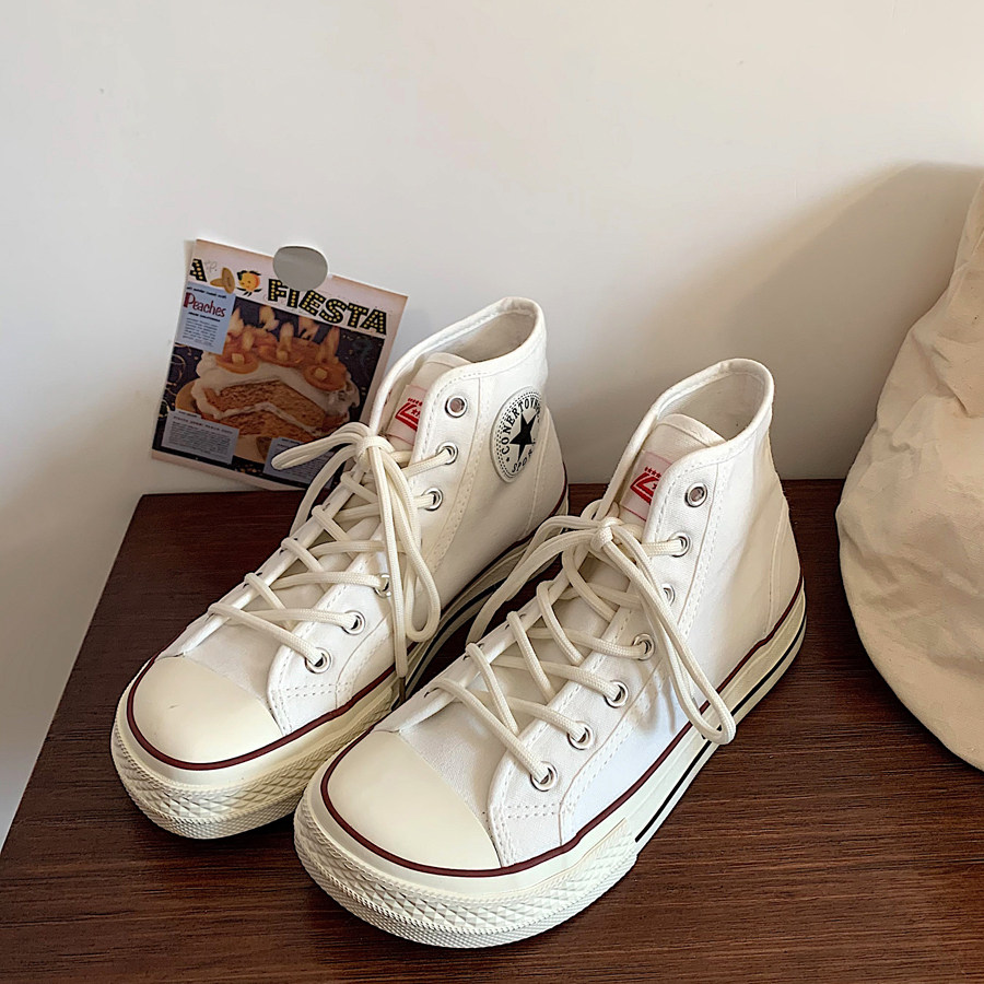 韩国ulzzang复古1970s白色高帮帆布鞋男小白鞋学院风系带休闲鞋女