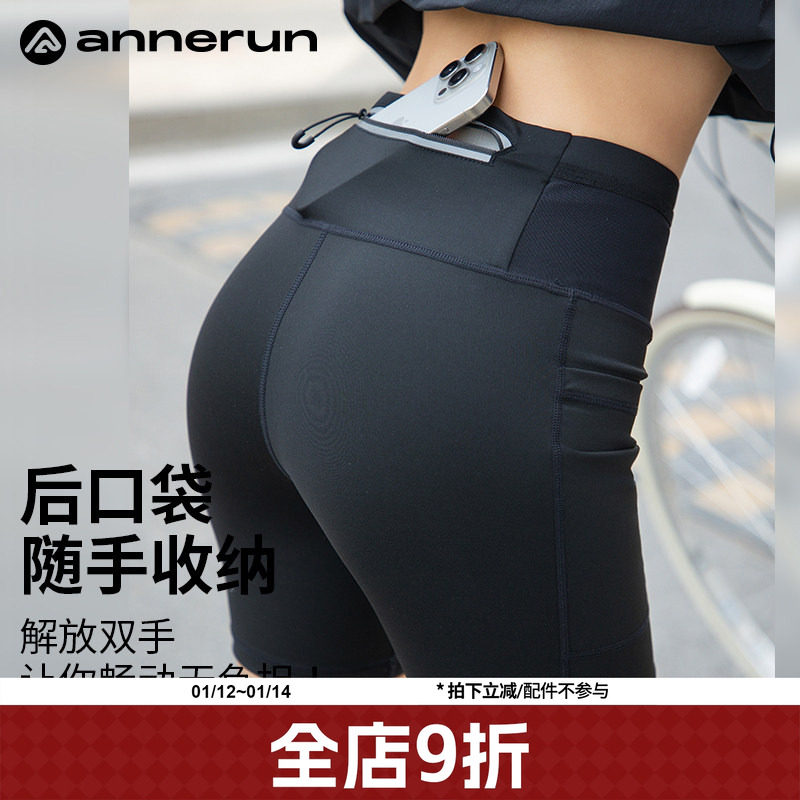 annerun带腰包骑行裤女款运动短裤外穿跑步健身裤训练四分压缩裤