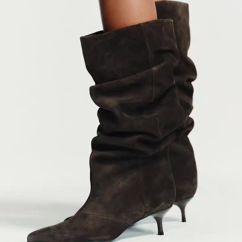 西班牙2026春冬季新款尖头褶皱欧美长靴绒堆堆高筒猫跟过膝瘦瘦靴