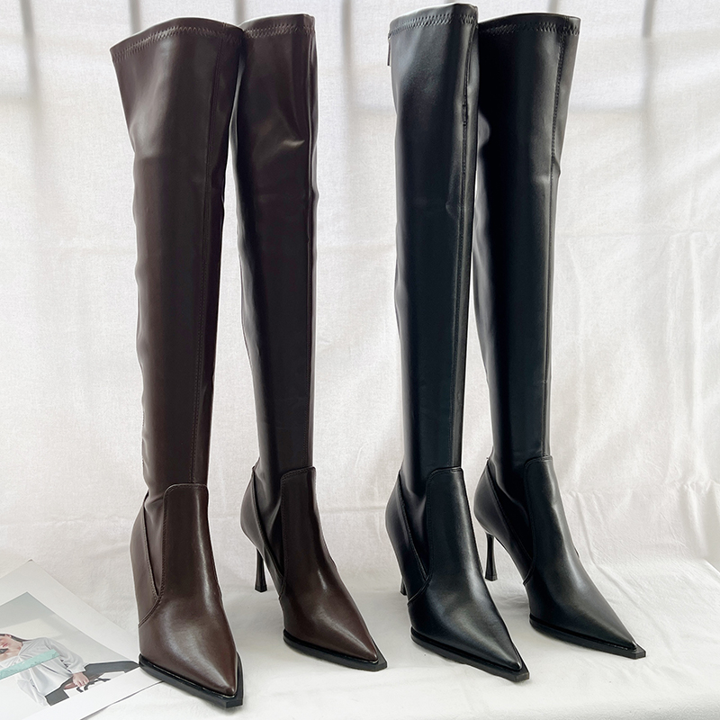外贸原单女靴气质时尚百搭新款尖头纯色粗高跟套筒时装长靴过膝靴