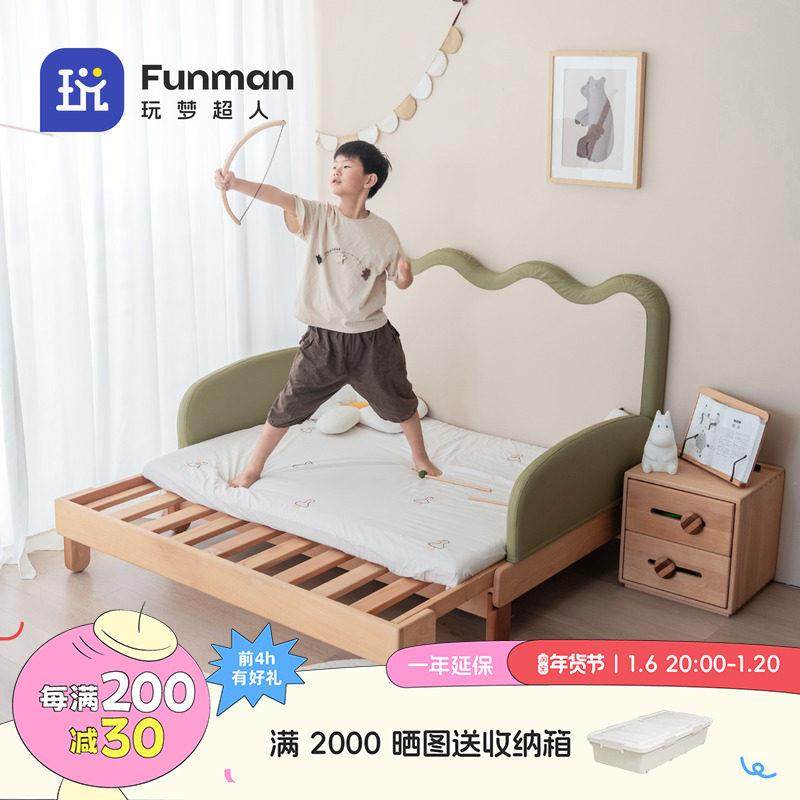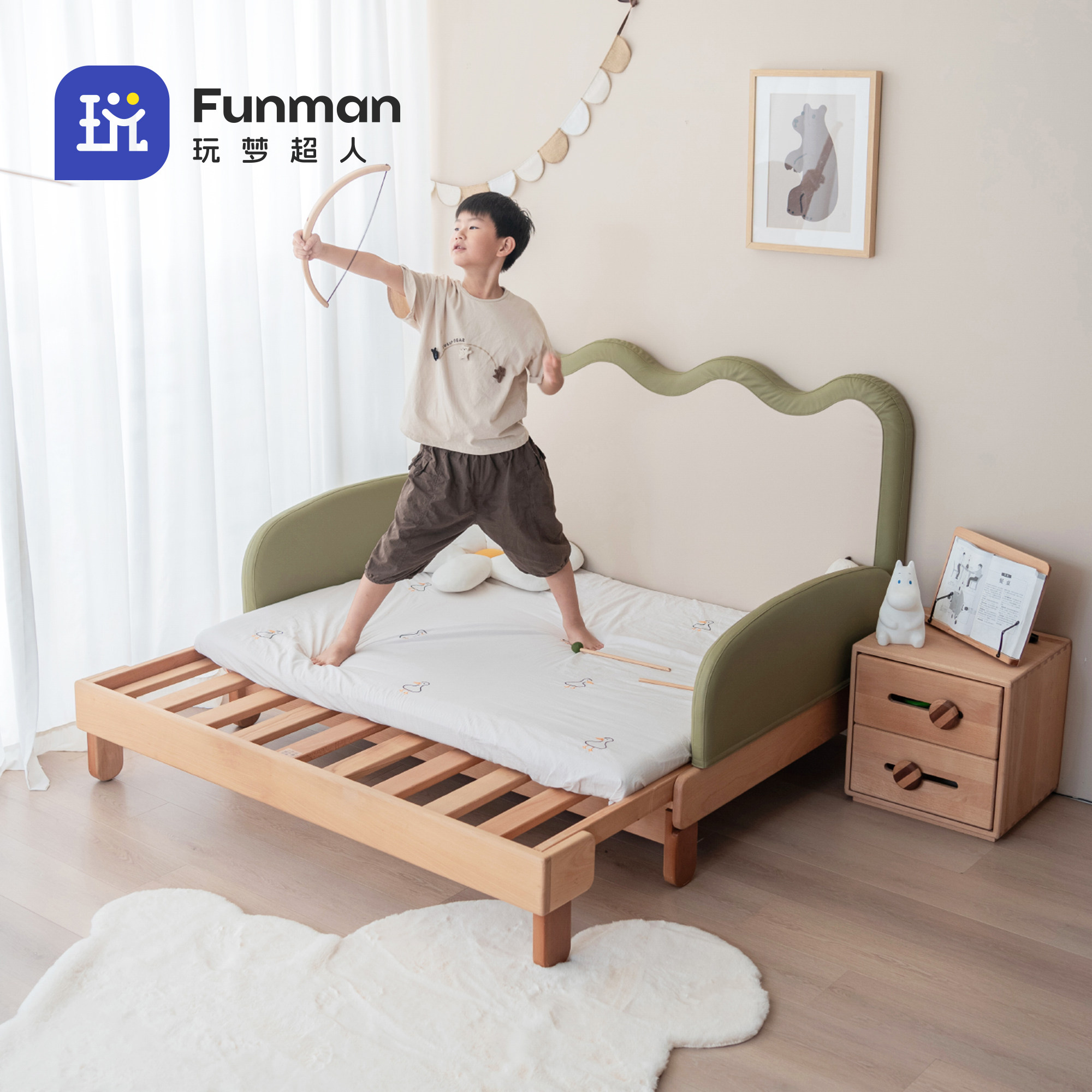 玩梦超人 儿童伸缩床 全实木男孩女孩半包围护栏小孩儿童房抽拉床