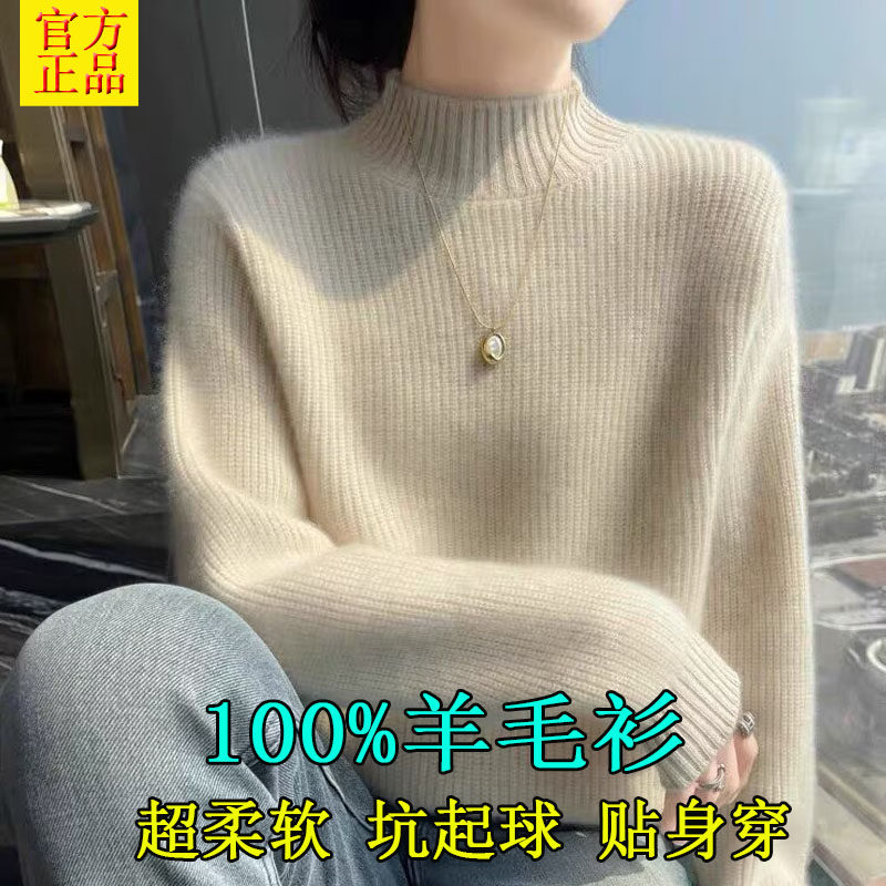 新款100纯羊毛衫女士半高领双股保暖加厚毛衣内搭宽松软糯打底衫