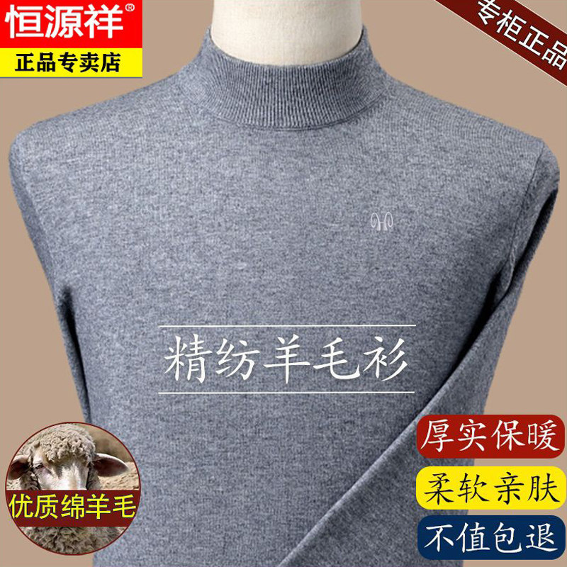 恒源祥正品冬季100%纯羊毛衫男士半高领加厚毛衣保暖打底中年针织