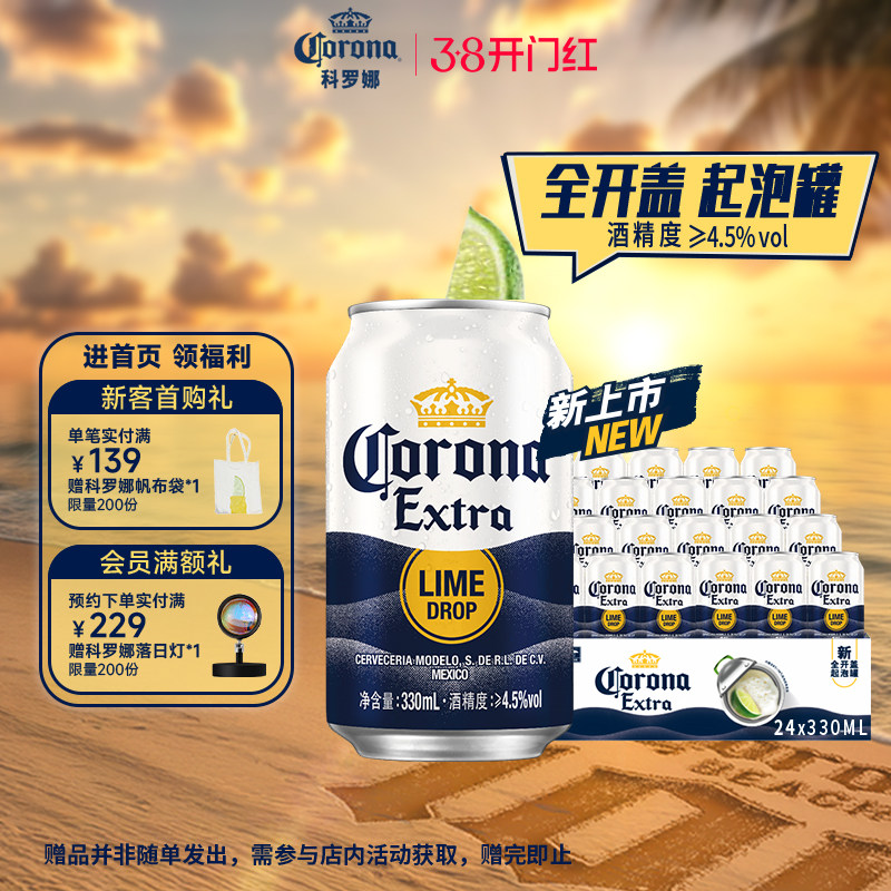 【新品上市】科罗娜全开盖啤酒330ml*24听起泡罐11.3°P整箱批发