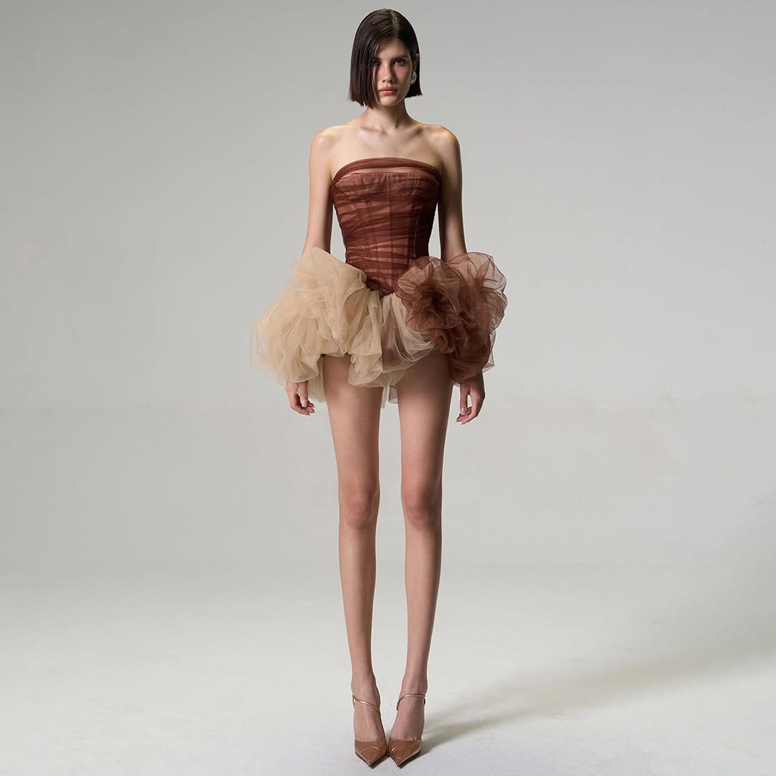 #Sisjuly#甜辣lovely轻纱拼接修身抹胸 不规则撞色蓬蓬短裙套装女