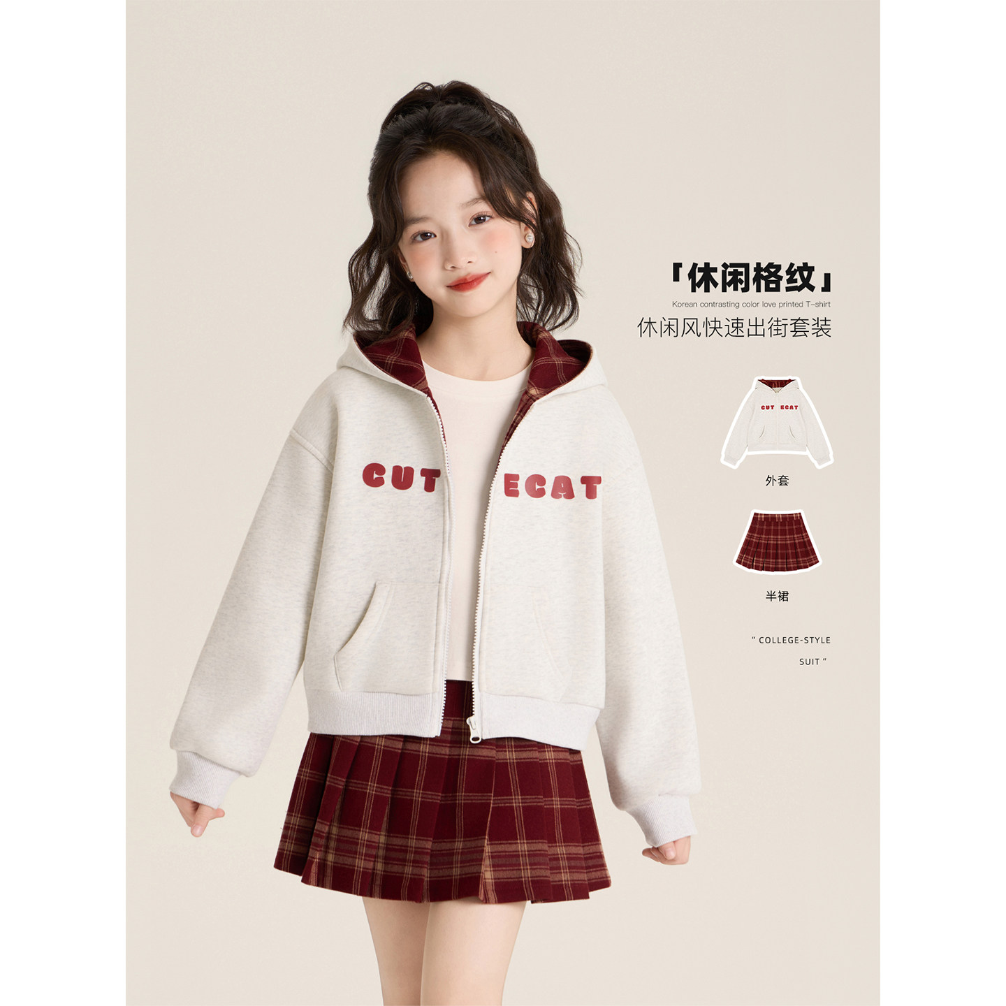 Amybaby女童套装冬季2025新款欧美风撞色连帽加绒拉链开衫百褶裙