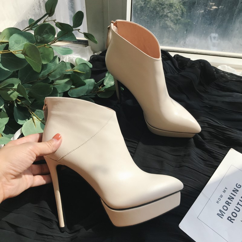 12cm防水台真皮短靴女尖头厚底粗跟米白色及裸单靴超高跟时装靴子