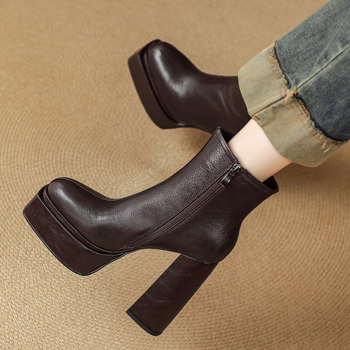真皮时尚靴女2025年性感超高跟15厘米粗跟短靴女时尚防水台女靴子