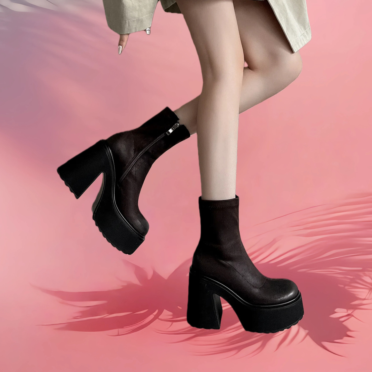 11cm超高跟短靴女2025秋冬新款方头粗跟防水台侧拉链瘦瘦时装靴子