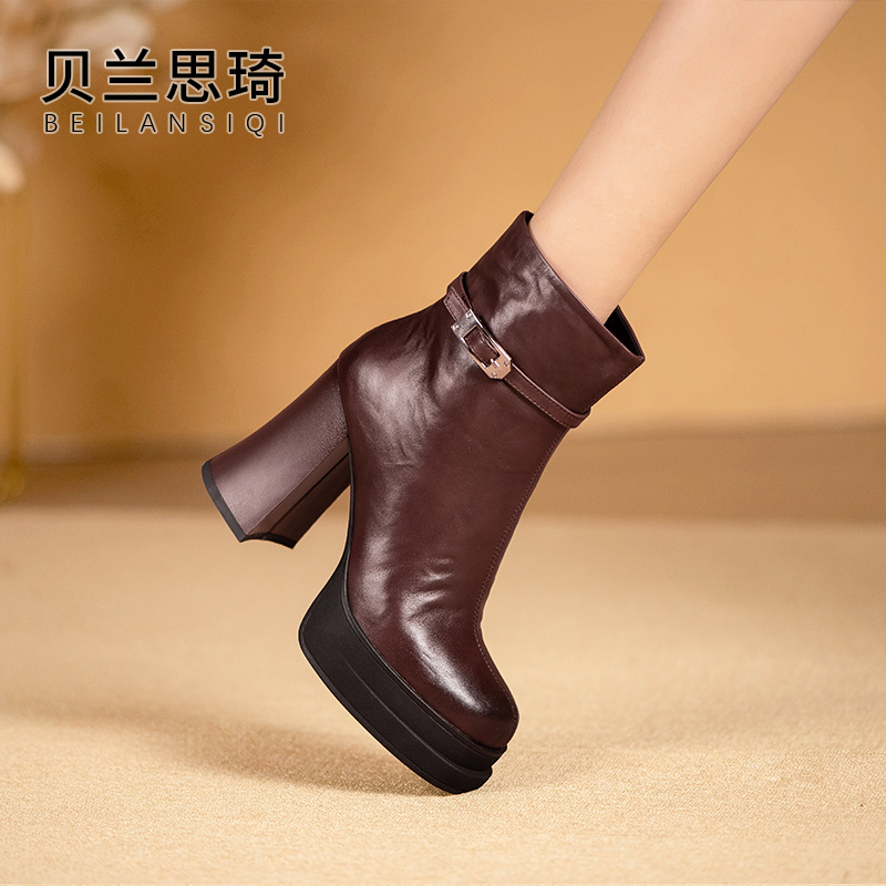 简约高级厚底高跟短靴女秋冬季新款短筒女靴防水台粗跟女士皮靴子