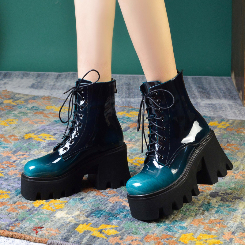 短靴女粗跟欧美风超高跟靴子短筒防水台亮面黑侧拉链漆皮宴会皮靴