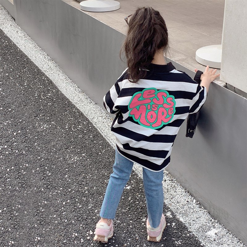 女童宽松T恤新款春装卫衣中大童韩版圆领条纹中长款卡通打底衫潮