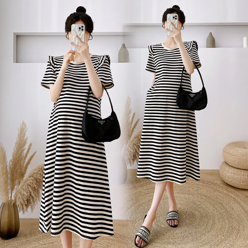 216出口单中长款条纹T恤连衣裙L80144春秋亲肤细腻绒直筒短袖中裙