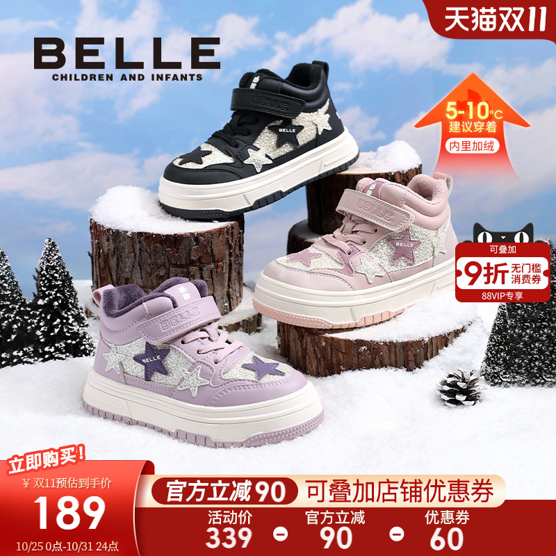 百丽童鞋儿童运动鞋加绒保暖运动鞋女童高帮板鞋冬季新款宝宝鞋子
