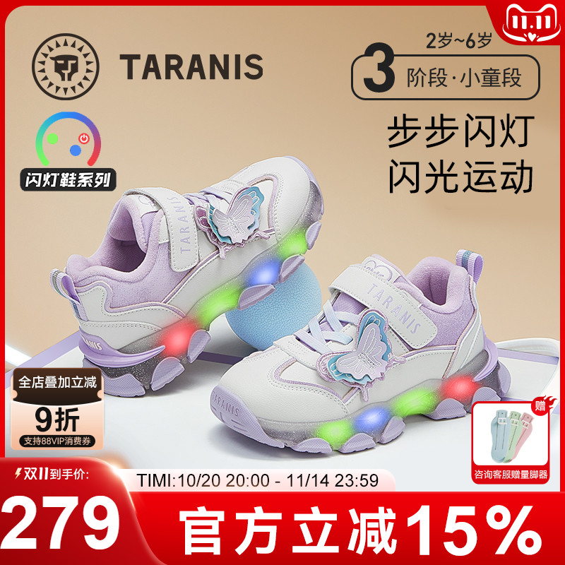 泰兰尼斯2025冬季新款女童闪灯鞋加绒保暖运动鞋女孩软底亮发光鞋